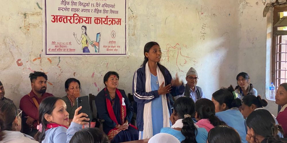 विराटनगर, मंसिर २१ — नेपाल युवा संरक्षक मञ्चले लैंगिक हिंसा विरुद्धको १६ दिने अभियानअन्तर्गत आइतबार विराटनगरस्थित आदर्श बालिका माध्यमिक विद्यालयमा ‘साइबर सुरक्षा र लैंगिक हिंसा’ विषयक अन्तरक्रिया कार्यक्रम सम्पन्न भएको छ। डिजिटल प्रविधिको तीव्र विस्तारसँगै बढ्दै गएको अनलाइन जोखिमबारे विद्यार्थीमा सतर्कता जगाउने उद्देश्यले कार्यक्रम सञ्चालन गरिएको हो।